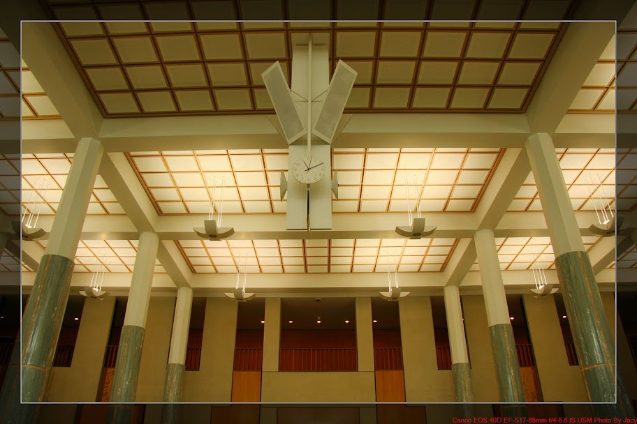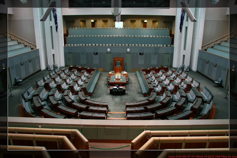 联邦新议会大厦(The Parliament house),它是集建筑艺术、工艺美术和装饰艺术完美壮观的统一体,它反映着澳大利亚的历史、迥然不同的多元文化、国家的发展和对未来的抱负。 议会大厦占地32公顷,随首都山的起伏,雄踞于山中。 山顶便是大厦的屋顶,上面覆盖有绿绿的青草,以此来保护这座小山丘的形状。 屋顶上还矗立着一根高81米、重220吨的不锈钢旗杆,旗杆上飘扬着一面长12.8米、宽6.4米的澳大利亚国旗,构成了首都的中心,也成为堪培拉的标志性建筑。 同时,如果以联邦议会大厦为轴心,从北到东,或是从南到西,我们可以看到它都与旧联邦大厦,澳洲战争博物馆,以及安斯列山同在一条直线上。 这一独特的建筑风格是由一位意大利著名的建筑设计师吉乌尔古拉设计,并于1988年澳大利亚建国200周年时正式建成并启用,共耗资11亿澳元。议会大厦为矩形,建筑面积达25万多平方米有4500多间房间,展示了澳大利亚的精湛艺术和工艺美术。 在这座大厦里,陈列着许多艺术品,其中约有70多件是专门制作的,3000多件是收购的名画、雕塑、饰精品和照片。大厦里有一个画廊,里面有澳大利亚联邦成立以来历届总理的画像。大厦内的一条长长的走廊,连接着西面的参议院和东面的众议院,我们去的时候没有开会但可以在里面拍照,如果巧遇参众两院开会,来访者还可以坐在旁听席上听总理、部长们和反对党的辩论呢。