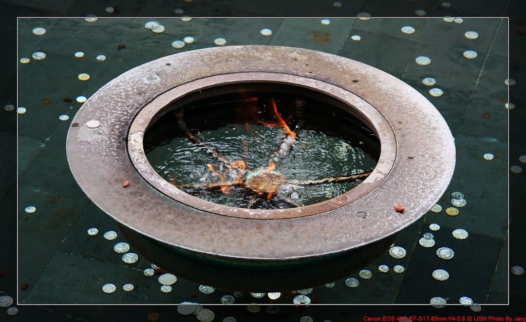 长明火,以此纪念死去的英魂,有很多人往池里面投硬币,是不是象许愿池一样.老婆也放了一颗.